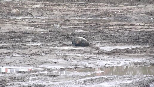 Экскаватор перекидывает жижу вокруг себя и результаты очистки пруда