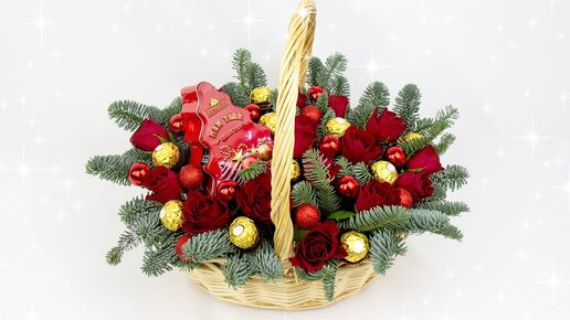 Зимний букет из роз в корзине. Подарок на Новый Год 2022 своими руками