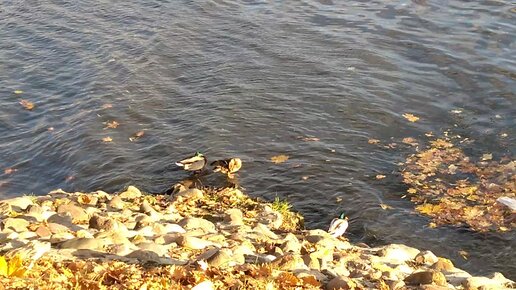 Утята ежатся от холода и предпочитают оставаться на берегу