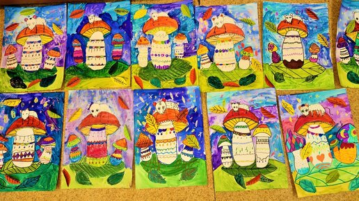 Веселый осенний сюжет. Дети рисуют осень поэтапно. Рисование в школе.