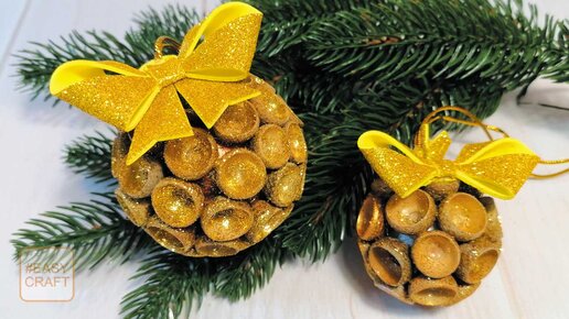 Поделка на елку из природных материалов. Золотой шар на елку с бантиком из фоамирана. Новогодний декор своими руками.