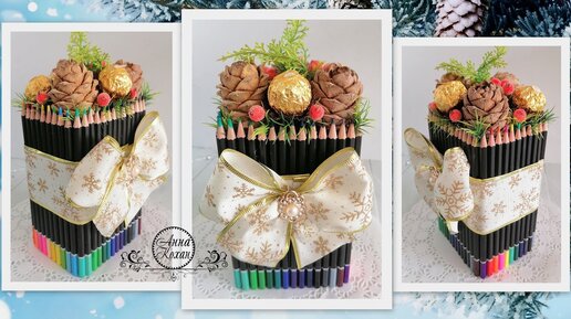 DIY✏КОНФЕТНАЯ КОМПОЗИЦИЯ из КАРАНДАШЕЙ и ШИШЕК✏Новогодний подарок своими руками✏
