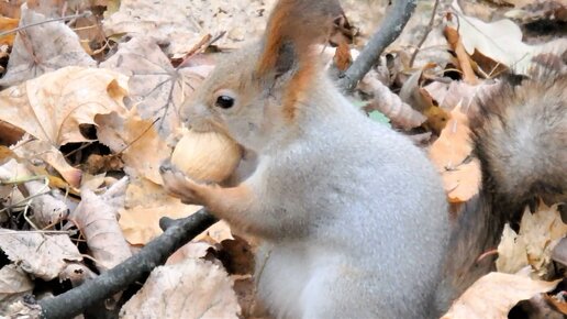 Проблемы белки с большим орехом, а ещё белка показывает, что может прыгать как зайчик