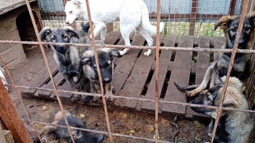 Наши первые щенки с мусорки. Подросли, но пока ютятся в одном вольере, в одной будке