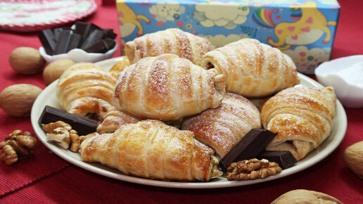 Очень вкусные круассаны из слоеного теста. Готовлю круассаны с шоколадом и грецкими орехами из готового слоеного теста