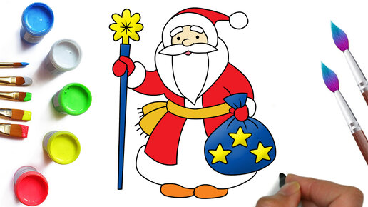 Как нарисовать деда мороза с мешком подарков, лёгкие новогодние рисунки для детей и малышей, рисунки для раскраски