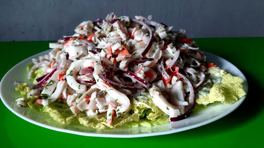 Отличный салат на праздник - "Новинка" с оригинальной заправкой. Лёгкий, нежный салат с кальмарами и крабовыми палочками.