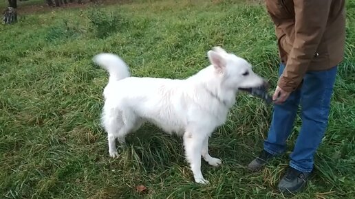 Белая швейцарская овчарка приносит хрюкающую игрушку-кабанчика 🐗