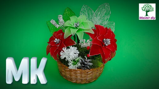 Зимняя Новогодняя композиция Цветы Пуансеттии из капрона своими руками\Master diy