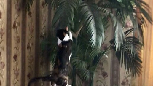 Котёнок Дашка высоко прыгает на пальму. Ёлку на Новый год, нам лучше не ставить