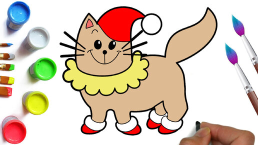 Как нарисовать новогоднего кота в шапочке легко и просто, красивое рисование для детей и малышей на новый год и рождество