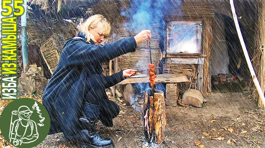 🔥 Готовлю вертикальный шашлык в финской свече во время дождя 🪓 Бушкрафт в Избе из камыша - Серия 55