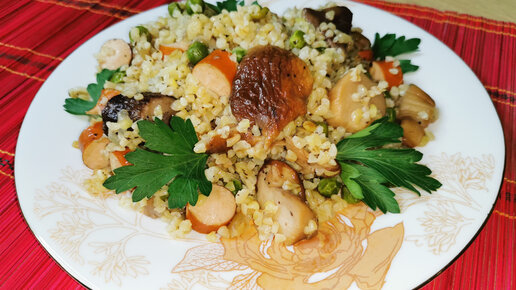 Вкусно и незамысловато. Булгур с сосисками и белыми грибами.