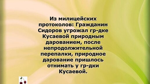 Их милицейских протоколов: Гражданин Сидоров угрожал гр-дке Кусаевой... Анекдот
