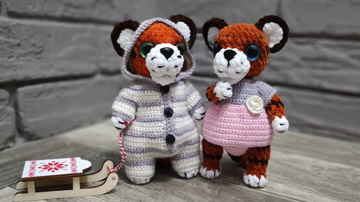 Вязаный из плюшевой пряжи тигренок в одежде / Knitted tiger cub in clothes