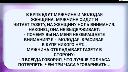 В купе едет мужчина и молодая женщина. Мужчина сидит и читает газету, на женщину ноль внимания... Анекдот