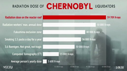 Сравнение дозы облучения, которую получили ликвидаторы на крыше ЧАЭС (красным), измеряя в количестве доз облучения при рентгене