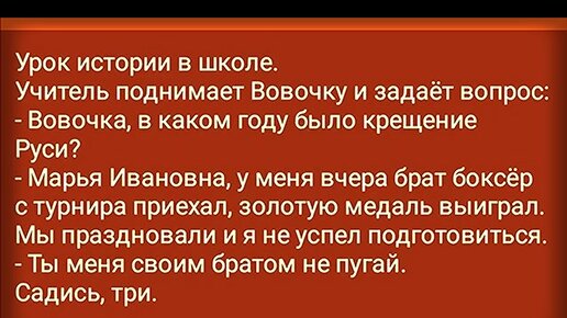 Урок истории в школе. Учитель поднимает Вовочку и задает вопрос: -Вовочка, в каком году было крещение Руси?... Анекдот