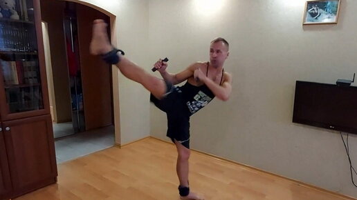 Бой с тенью с грузами на ногах по 1,5 кг, с грузами в руках по 1 кг