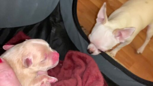 Малышка чихуахуа, знакомится с маленькими щеночками.