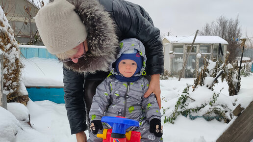 А у нас уже зима. Годовалый ребенок самостоятельно ходит по снегу.