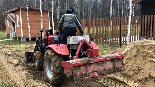 Развозим песок, планируем и перепахиваем участок на китайском минитракторе.