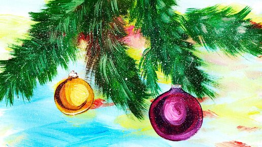 Как нарисовать новогоднюю картину. Рисуем шарики на елке. Рисуем новогодний пейзаж.
