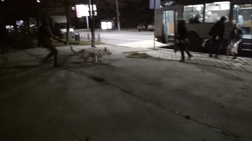 Белая швейцарская овчарка встречает бабушку с троллейбуса