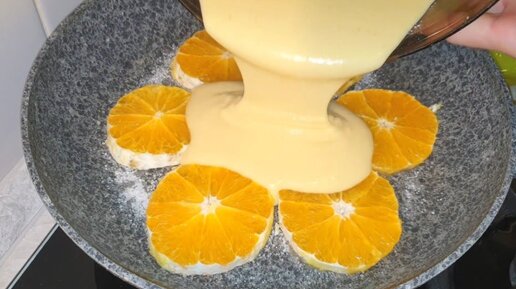 Рецепт приготовления пирога с апельсинами на сковороде. Тесто готовлю на основе яиц, муки и теплого молока (показываю рецепт)