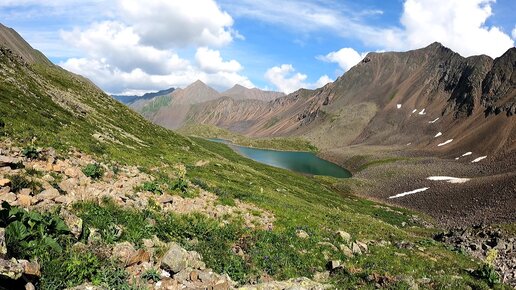 перевал Шумакский озеро в горах снег в распадке солнечный день