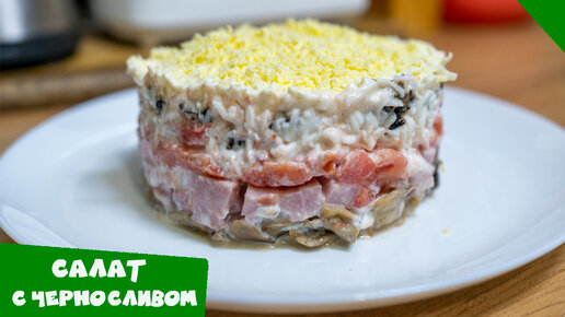 Слоеный салат с ветчиной, черносливом и шампиньонами