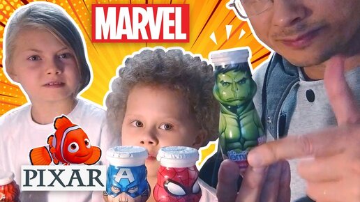 Супергерои Marvel и персонажи мультфильмов Pixar на бутылочках Actimel из магазина Пятёрочка