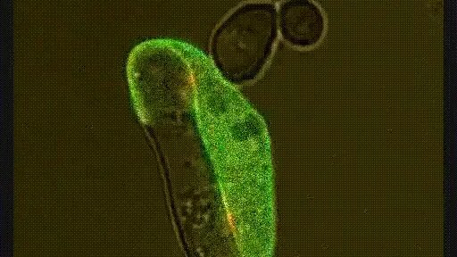 Амёба (Dictyostelium discoideum) пытается проглотить сахаромицету