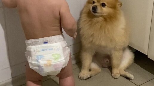 Малыш и шпиц. Реакция собаки на грудного ребёнка. Пёсик и грудничок