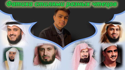 Сура аль Фатиха голосами (стилями) разных чтецов : Судейс, ас-Судейс, Мишари Рашид, Саад аль Гамиди и т.д.