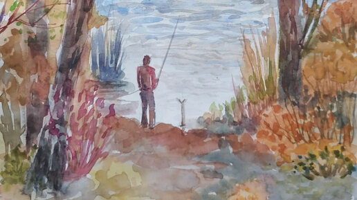 🎨Пейзаж 🖌️На рыбалке🖌️рисование акварелью