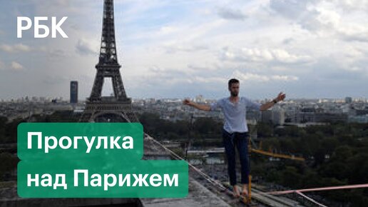 По канату, на высоте 70 метров, между Эйфелевой башней и театром. Видео канатоходца из Парижа