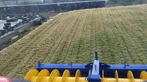 Вид из кабины трактора на трамбовку сенажа трамбовщиком КТ-3