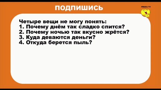 Четыре вещи не могу понять: 1. Почему днем так сладко спится? 2. Куда деваются деньги? Анекдот