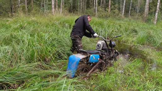 Полноприводный мотоцикл с двигателем от бензопилы в болоте