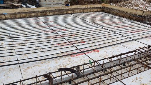 Утепление фундаментной подушки ЭППС Технониколь, установка арматурных каркасов и вязка арматуры бетонной фундаментной плиты