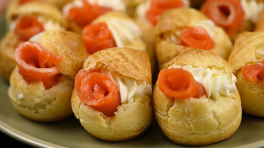 Новогодняя закуска. Профитроли с сыром и красной рыбой на праздничный стол.