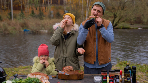 Готовит мужчина и дети: вкуснейшее мясо на гриле, завернутое в бекон