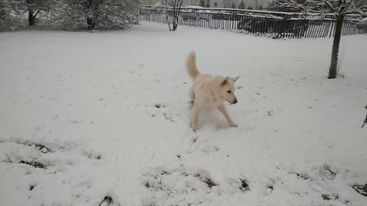 Белая швейцарская овчарка ловит свежевыпавший снег и ест, прямо как мы в детстве ❄