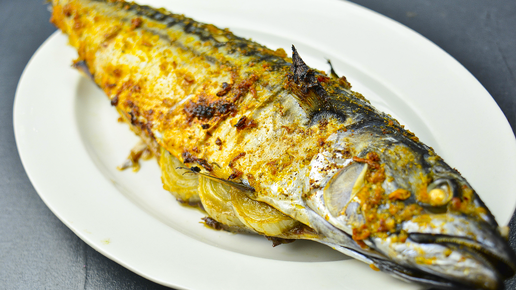 Цельная скумбрия запеченая в духовке. Обмазал маринадом и в духовку