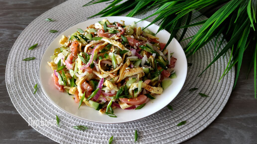 Салат из красной рыбы с огурцами и яичными блинчиками.