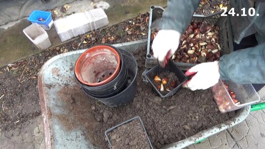 Осенняя посадка луковичных в прикопанные контейнеры. Передержка контейнеров с луковичными в теплице.