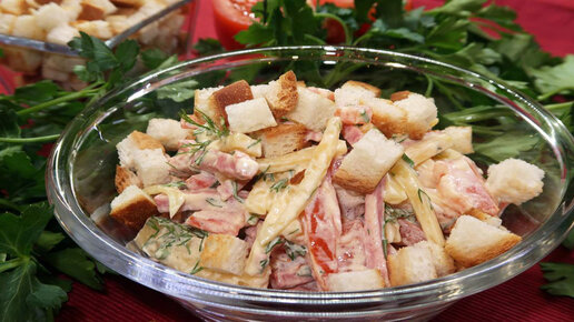 Простой рецепт очень вкусного салата с колбасой, сыром и сухариками на скорую руку