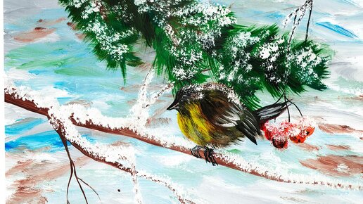 Нарисуем синицу на ветке. Рисуем зимний пейзаж. Синица гуашью. Правополушарное рисование.