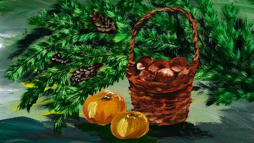 Как нарисовать новогоднюю картину. Рисуем новогодний натюрморт гуашью. Натюрморт легко. Корзинка.
